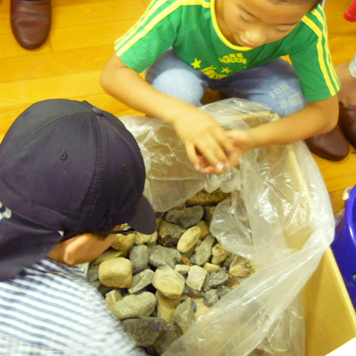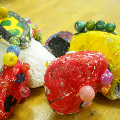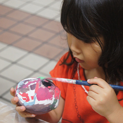 「いしころアート」はアトリエKIRAKOがいちばん得意とするワークショップです。自然物である石をキャンパスにして絵の具を塗り、ビーズを付けてデコレーションします。他の何でもない何かが生まれるワークショップです