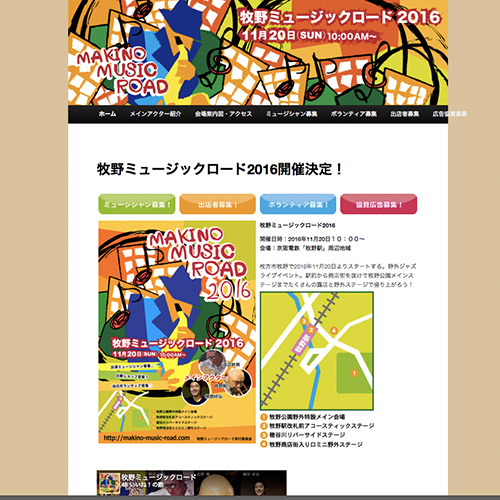 今年初開催となる大阪府枚方市「京阪牧野駅」周辺で行なわれる音楽祭のビジュアルデザインとweb製作をしております。開催日の11月20日まで随時最新情報をお届けします。http://makino-music-road.com/