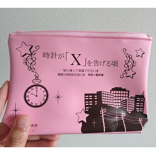 寝屋川特設防犯協力会様と寝屋川警察署様からのご依頼で防犯キャンペーンで配布するポーチのイラストを描かせて頂きました。このポーチは寝屋川市内で300個配布されました。